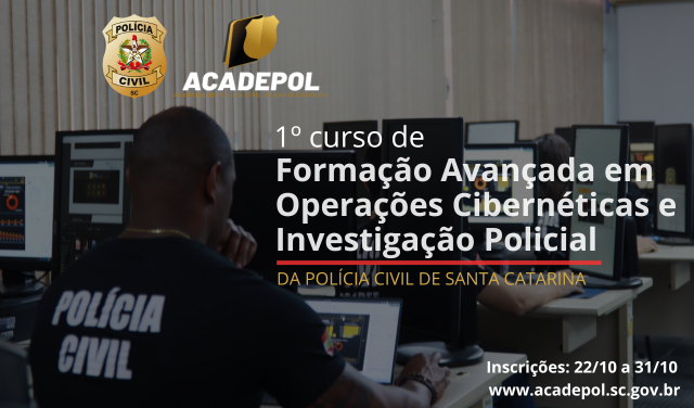A Academia de Polícia Civil de Santa Catarina (ACADEPOL/PCSC) informa que estão abertas, de 22 a 31 de outubro de 2025, as inscrições para o processo seletivo do curso Formação Avançada em Operações Cibernéticas e Investigação Digital – CyberOPS.